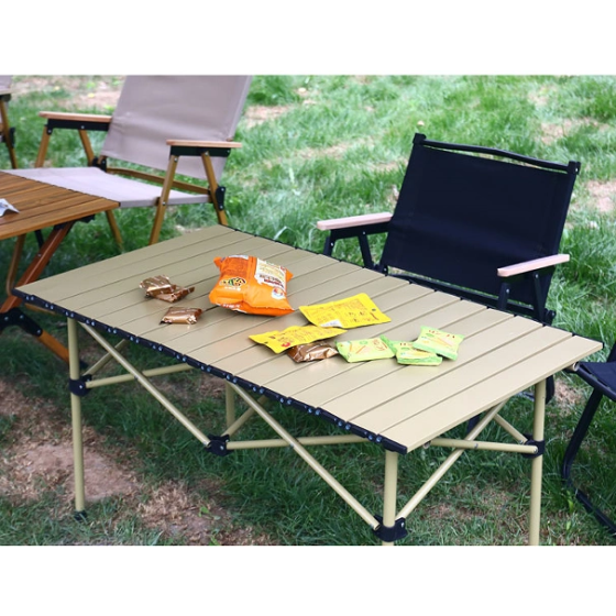 Folding Outdoor Table w/Gold Steel Frame & Woodgrain Top 95x50x50cm (75.8lbs) - 4 Legs + Collapsible Frame + Beige Carry Bag. Compact for Camping/Picnics - Steel, PP Buckles & Oxford Fabric for Space-Saving Portability!