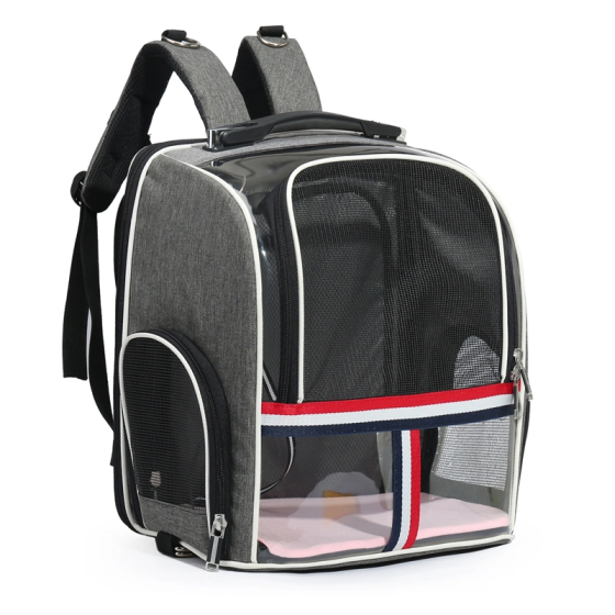 pet backpack with dark gray, red, and black checkered, expandable rear mesh compartment and transparent front window | 33 x 22 x 40 cm breathable double-shoulder cat bag | Double side storage pockets | 1 piece, no accessories baigou