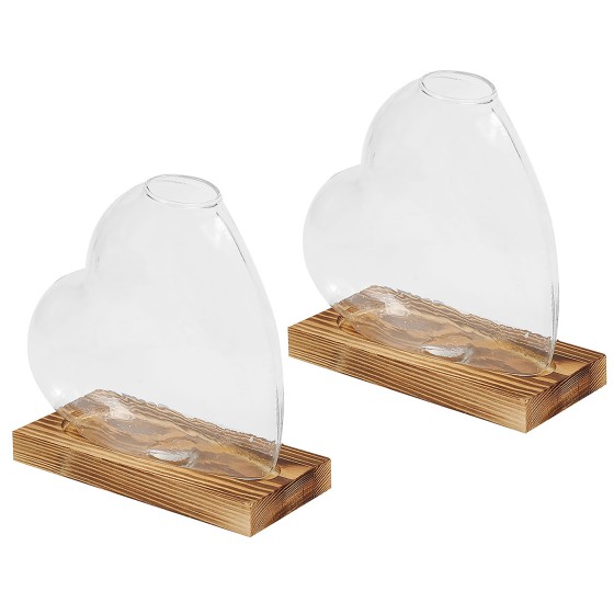 双心形玻璃花瓶2只装+实木底座 | 北欧风水培植物桌面摆件 (含2花瓶2底座/总重约390g) 圣诞礼物复古家居装饰 YM 250224FB03-2