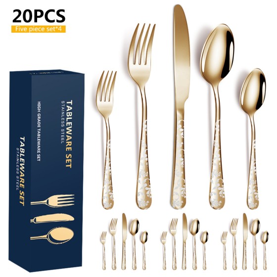 H 20件套A款金色西式不锈钢餐具 4人份刀叉勺套装 含茶叉茶勺 适用家庭派对 YMH45931G
