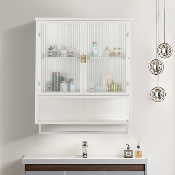 60厘米现代浴室镜柜 带毛巾架双门玻璃壁挂柜 双层储物+开放层板 卫生间玄关收纳柜(白色)