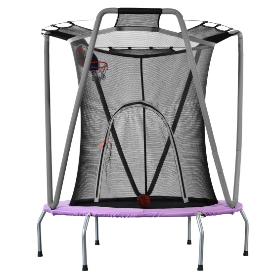 【带防护网】儿童蹦床 157cm家用室内外跳跳床 加厚钢管支架 附篮球框 U型双拉链门 承重50kg 适合3岁以上儿童 (灰色)