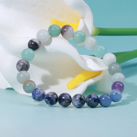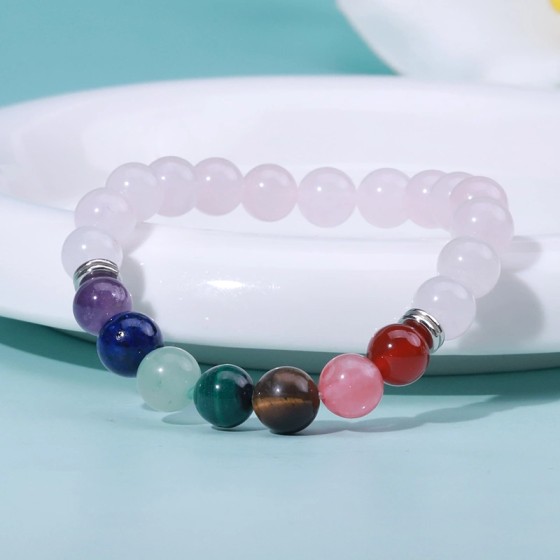 🌸 Seven Gemstones Stretch Bracelet|Rose Quartz + Amethyst/Lapis/Aventurine|8mm Mineral Beads 18cm Circumference|Silver Spacers|Cultural Symbol Jewelry