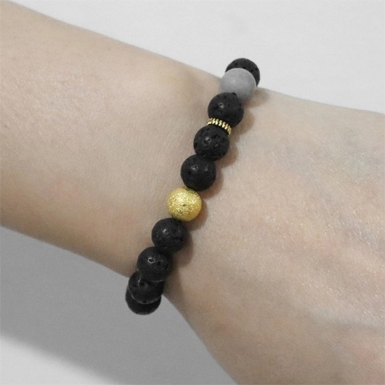 Stretch Lava Bead Bracelet: Natural Volcanic Stone & Speckled Yellow-Green Beads with Gold Spacers - 8mm Elastic Single Strand, 18cm Fit, No Extender Chain - Rustic Boho Jewelry for German Everyday Wear