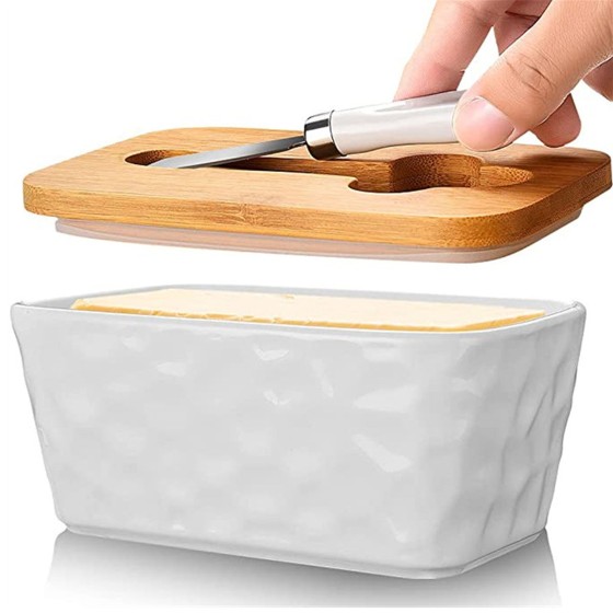 Stone-Finish Butter Dish with Knife Slot & Dual Seal | Ceramic Set + Stainless Cutter (Black/White) | Dishwasher-Safe Main Body | Wood Lid Hand Wash Only