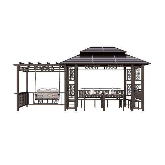 Outdoor Pavilion Set 3x3m|Metal Gazebo with Swing & Furniture|Integrated Shade Area + Vine Trellis|Pre-assembled Garden Structure Rust-proof Wood Grain