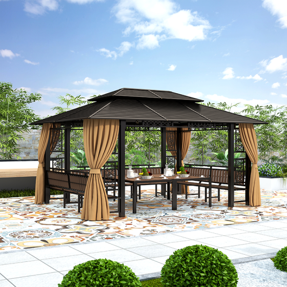 Outdoor Gazebo 4x3m All-in-One|Aluminum-Steel Frame with Furniture|Dual Roof: 0.4mm Galvanized/0.6mm Polycarbonate|Double Canopy Design & 30x30mm Seat Frame - Black Finish