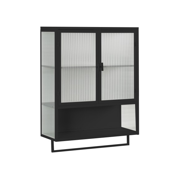 60cm Modern Double-Arched Mirror Cabinet, Black Metal Bathroom Cabinet with 2 Doors, Over The Toilet Storage with Open Shelf & Towel Bar, for Bathroom, Hallway