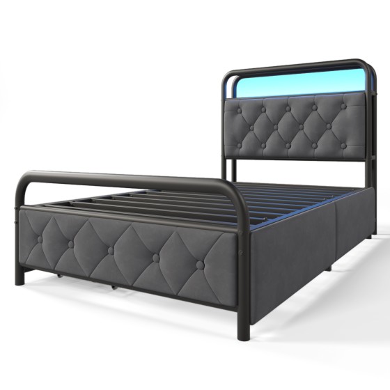 CE Certified Smart Upholstered Bed Frame No Mattress | USB-C Charging & APP Controlled RGB LED Lights | Grey Storage Platform with 2 Drawers | 90/140x200cm