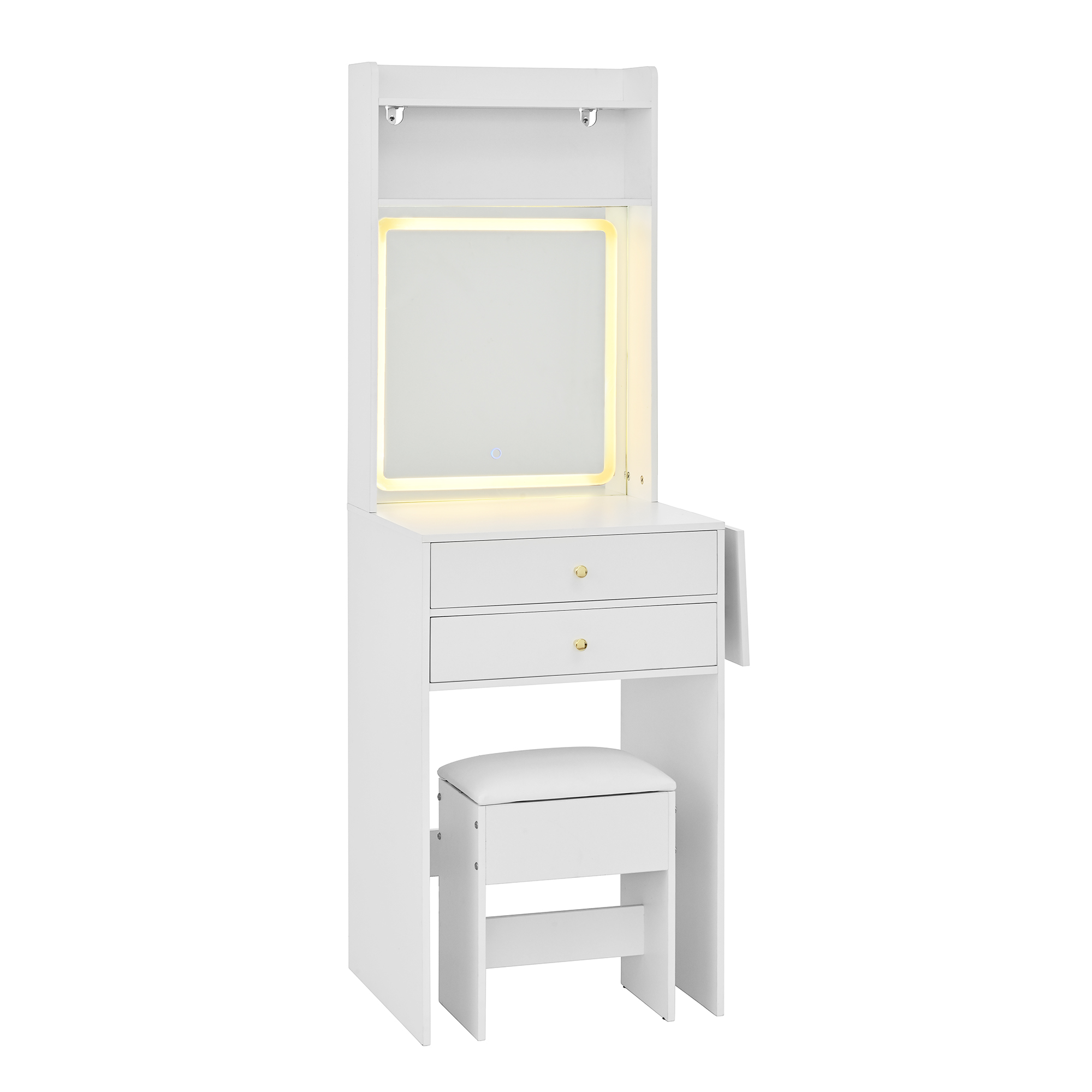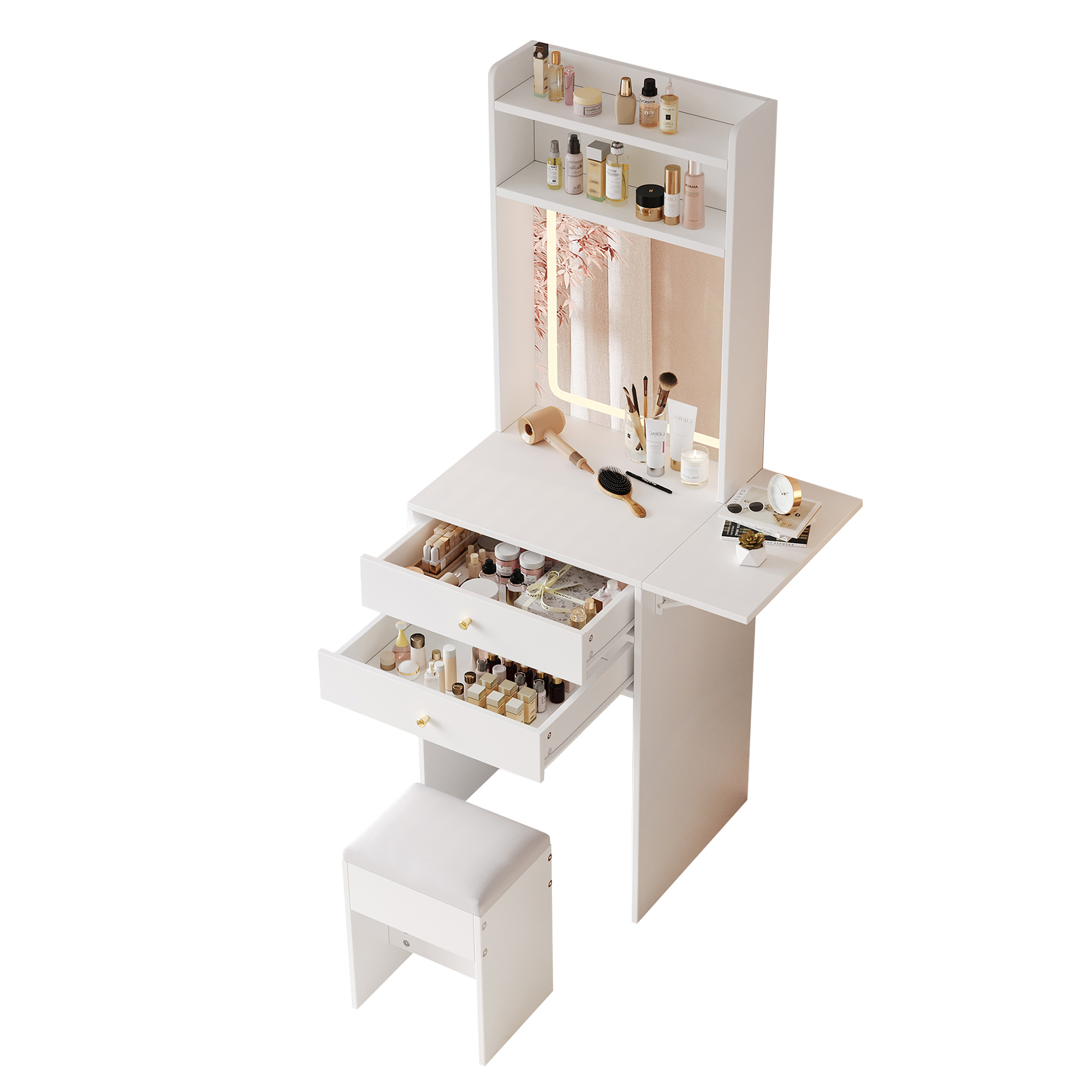 智能三色光化妆桌 带折叠镜含凳子 多层收纳储物梳妆台 小户型适用 白色
