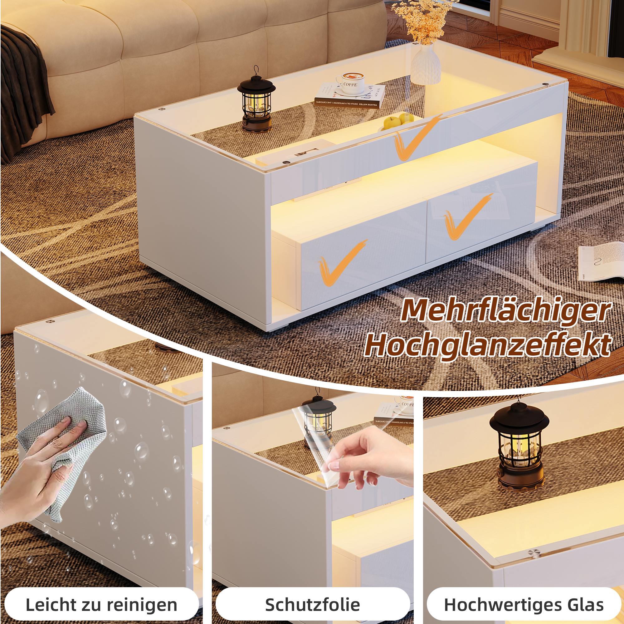 智能APP控制LED茶几 带两大抽屉双层储物现代简约客厅玻璃茶几 白色 100*50*40cm
